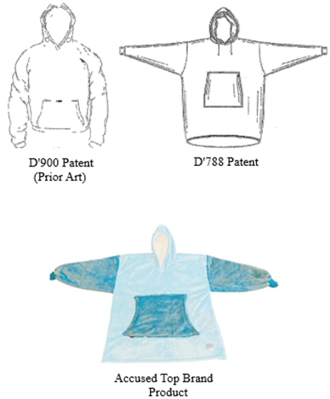 Cozy Comfort owns US Design Patent No. D859,788 for an enlarged hooded sweatshirt with a front pocket. Cozy Comfort also owns two trademarks for THE COMFY for goods and services related to blanket throws. Top Brand sought declaratory judgment of noninfringement of the design patent and Cozy Comfort counterclaimed for infringement of the D’788 Patent and the two trademarks.